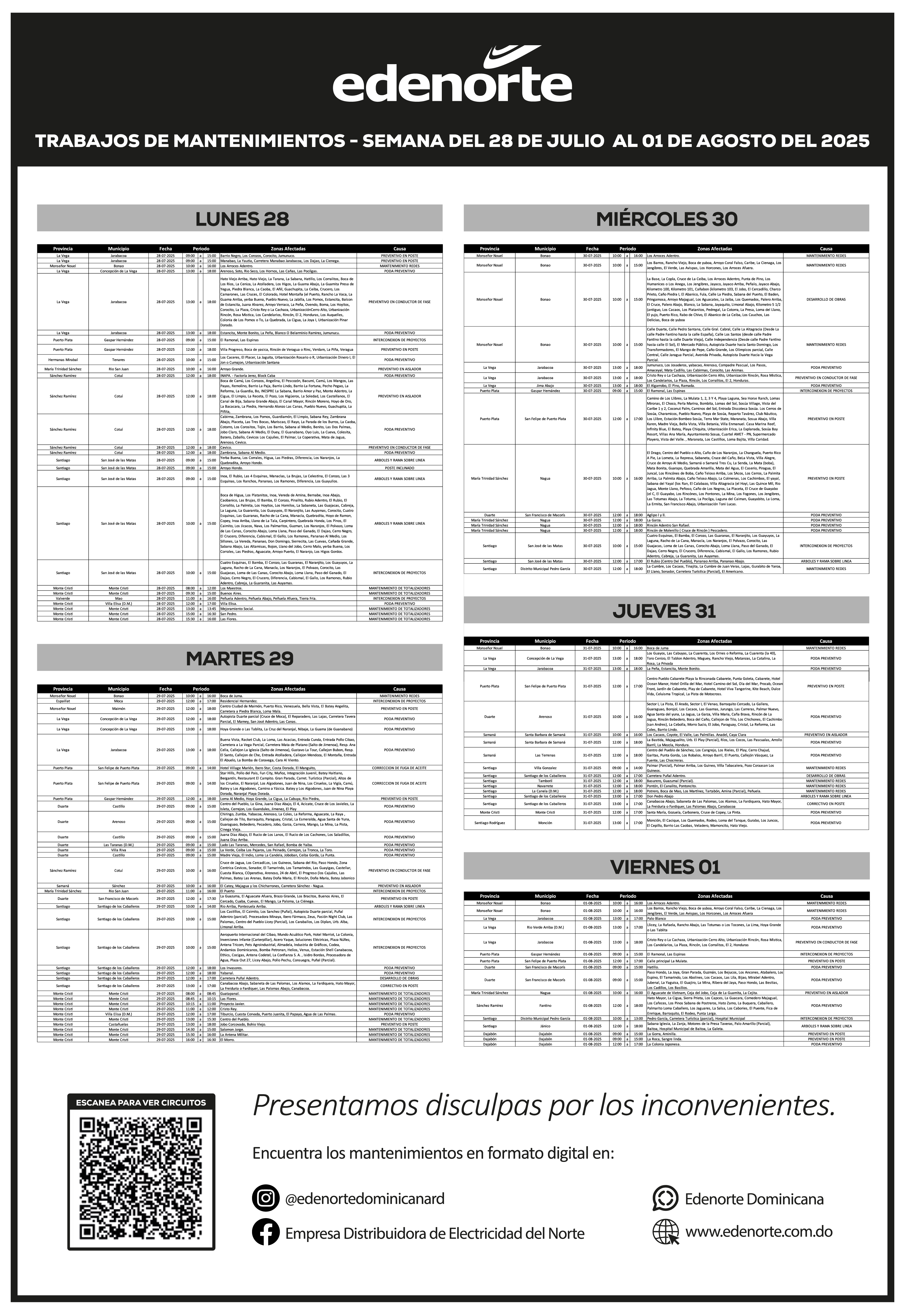 Mantenimiento de redes del 28 de Julio al 01 de Agosto