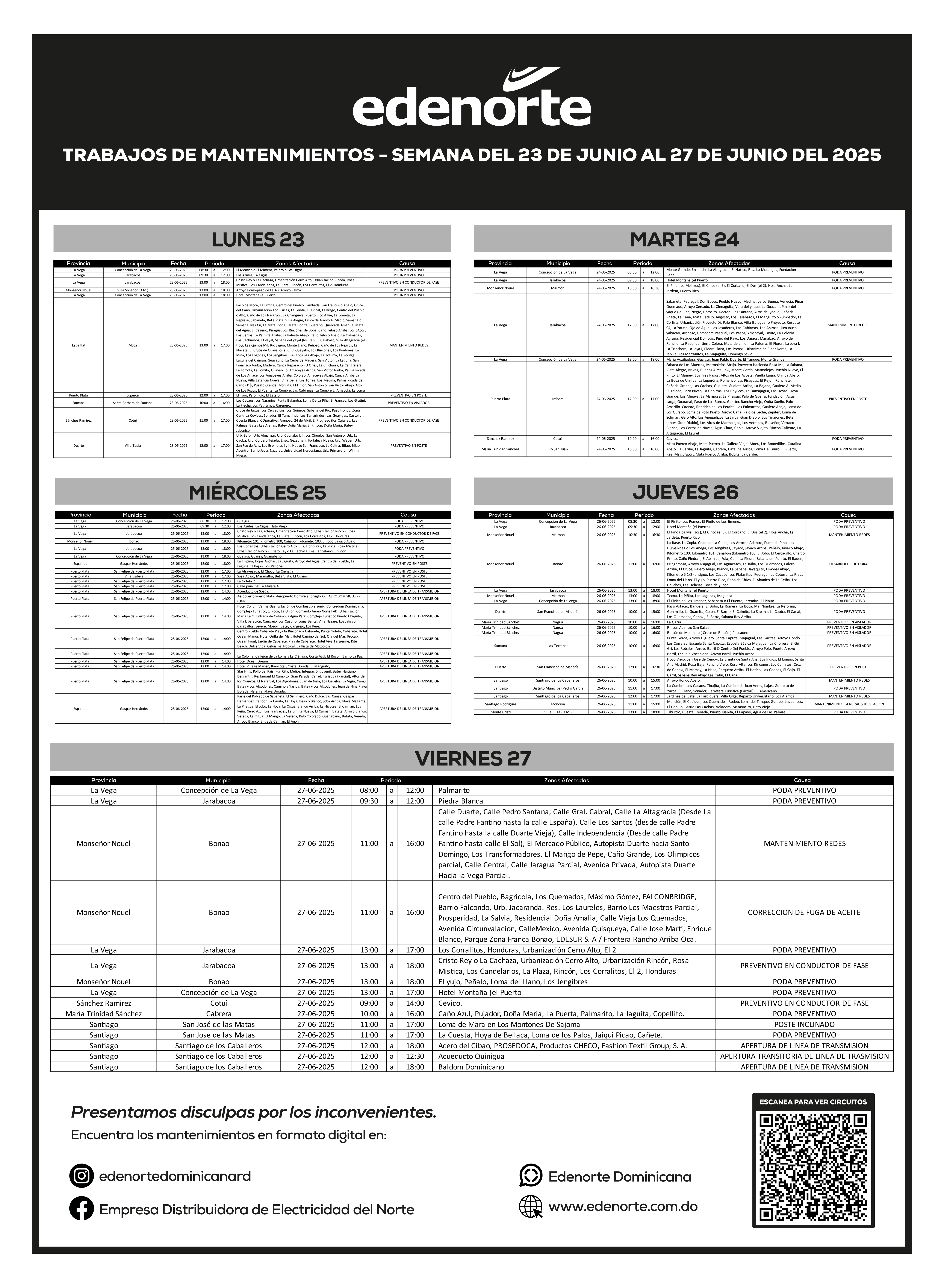 Mantenimientos de redes del 23 de junio al 27 de junio 2025