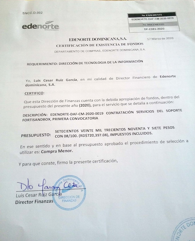 EDENORTE-DAF-CM-2020-0019 CONTRATACIÓN SERVICIOS DEL SOPORTE FORTISANDBOX, 1RA CONV.